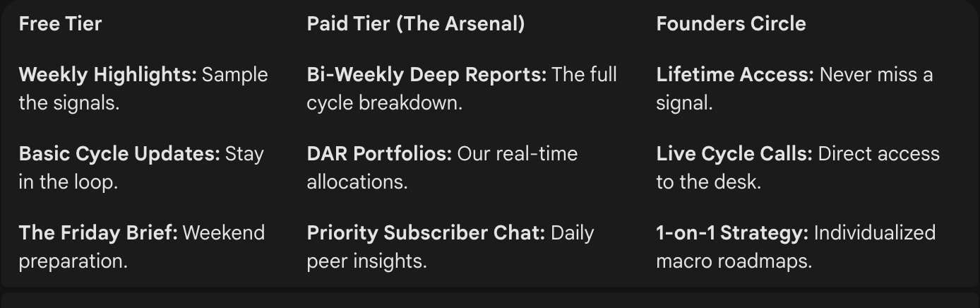 The Execution Toolkit: Everything you need from zero-to-pro execution (DEX swaps, yield farms) to 30/60/90-week alerts on key market milestones.