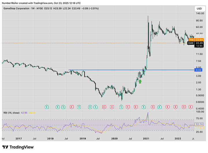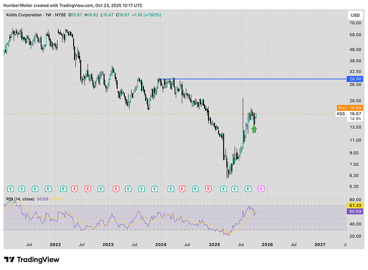Below is GME in 2020 and KSS today with the green arrow highlighting the final October low before the parabolic move higher.