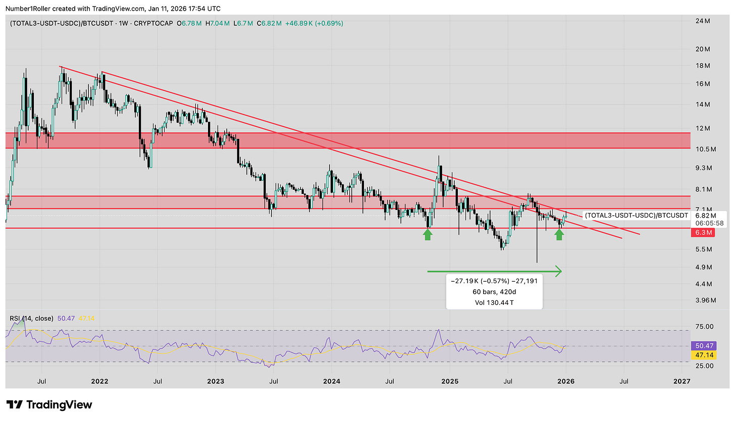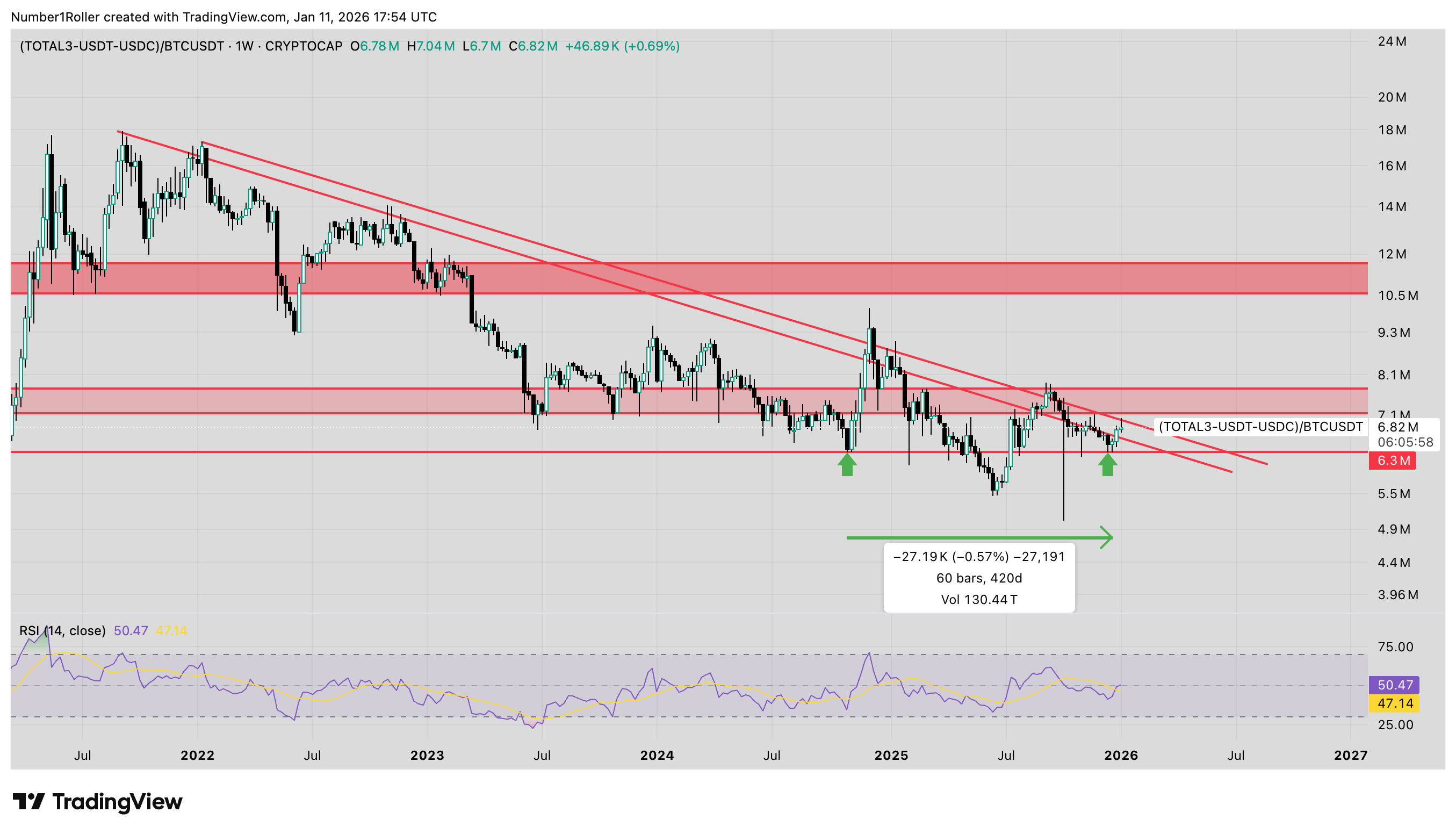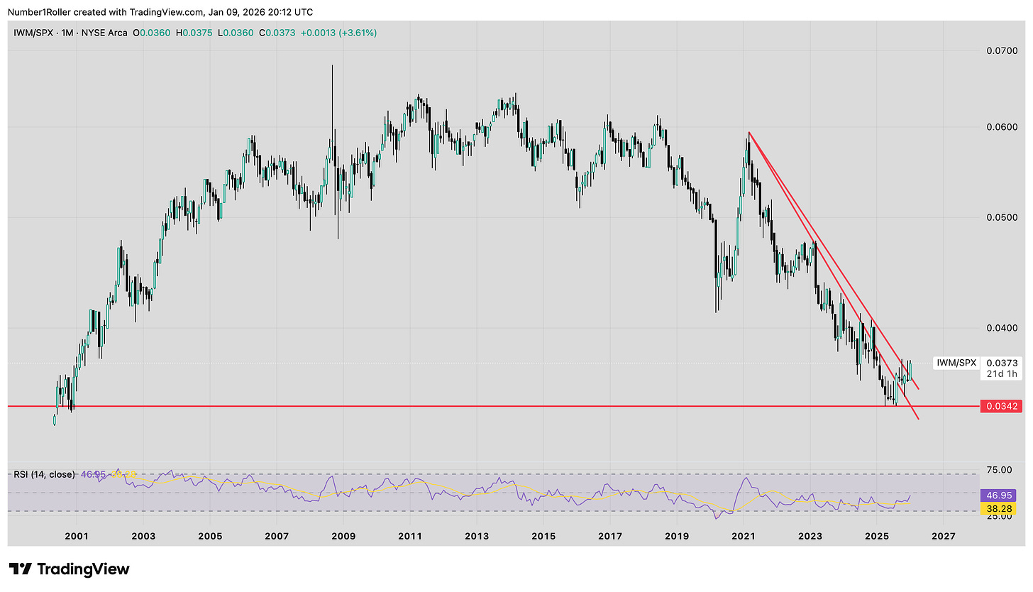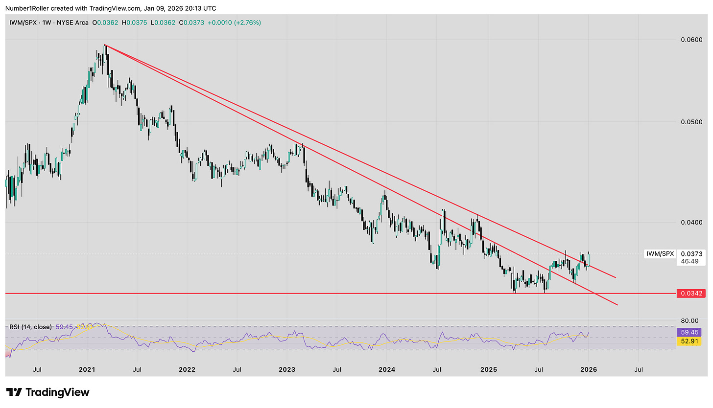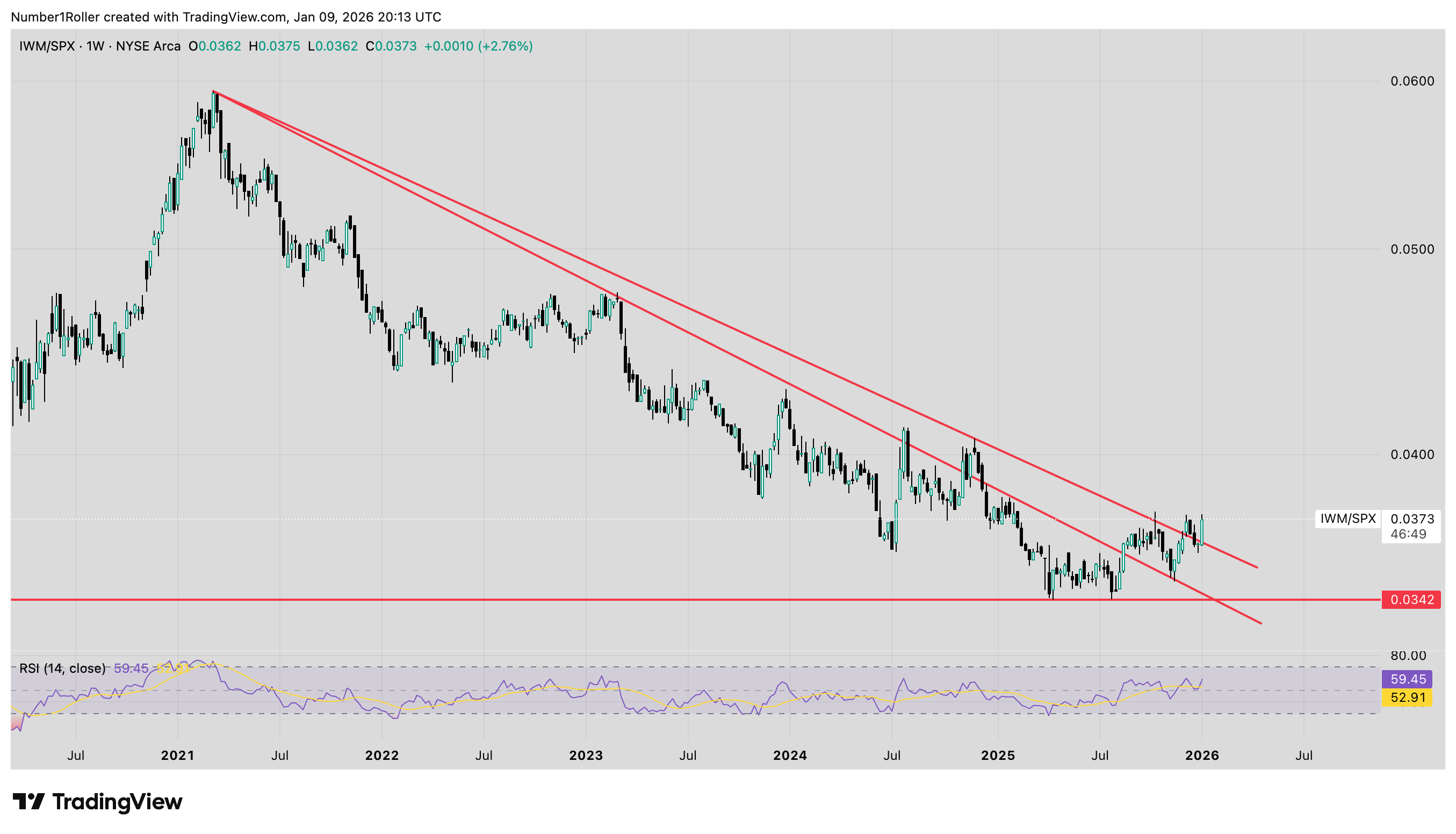 Look at the IWM/SPX chart. We are looking at a 25-year double bottom culminating with a massive signal candle. Zoom in further, and the 4.5-year downtrend looks identical to the Alt/BTC charts right before they explode.