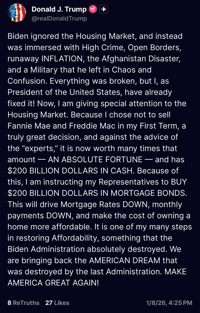 The Housing Shock: Trump’s directive for the government (via Fannie and Freddie) to buy $200 billion in mortgage bonds is a massive signal. It’s a direct attempt to force rates down and unstick the housing market.