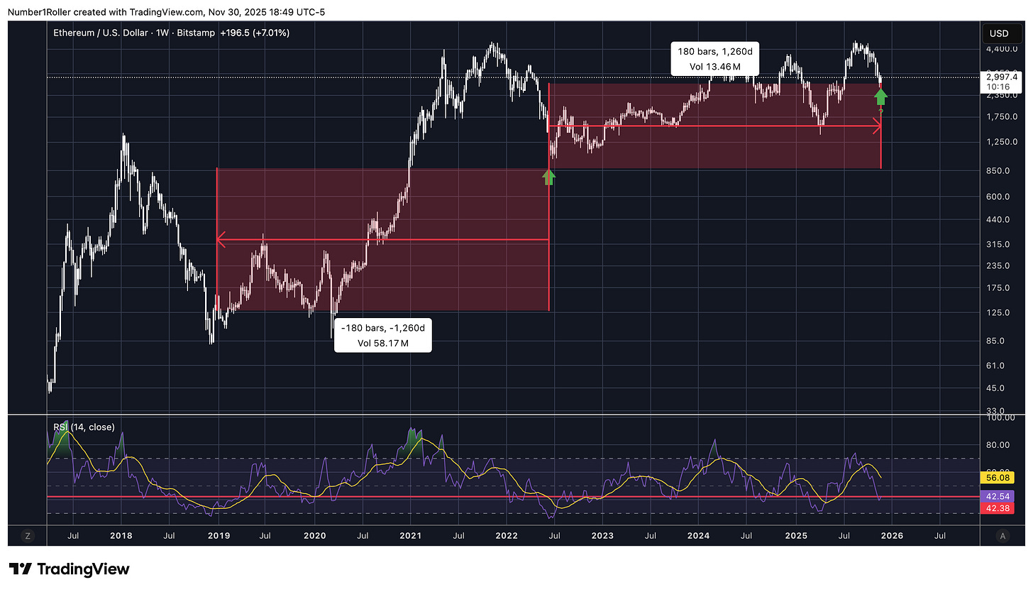 In fact, you can backtest it even further and see that the 2022 bottom came in at nearly 180 weeks exactly from the 2018 bottom.